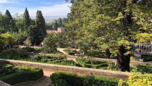 Más adelante, y ya casi en el llano que está debajo del monasterio de Santa Cruz, hay otros jardines y palacios medio arruinados que fueron también de los reyes moros; pero quedan en pié algunos restos y se conoce que el sitio era muy ameno, viéndose todavía algunos arrayanes y naranjos. Dicen que el jardín del convento de Santa Cruz era también de los reyes moros, y que el monasterio era el palacio. En la llanura, más abajo, y pasado ya el puente sobre el Genil, mucho más á la izquierda de los referidos, hay otro palacio que en gran parte se conserva todavía entero, con un hermoso jardín y gran estanque y con muchos arrayanes, que es también lugar muy apacible, al cual llaman el Huerto de la Reina. A lo que puede inferirse de tantos restos de sitios y palacios amenos y ricos, se ve que los reyes moros tenían todo lo que era menester para gozar una vida alegre y de deleites.